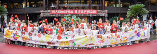 10月1日,“百人同绘双节庆 盐博童声颂家国”活动在天街拉开了帷幕。来自盐博馆的“盐小宝”和自贡小记者协会的百名青少年学生在天街齐唱《歌唱祖国》,表达对祖国的祝福。随后在两幅10米巨幅画卷上创作,一幅勾勒盛世山河,一幅绘就中秋团圆,将童真创意与家国情怀融入笔墨间。